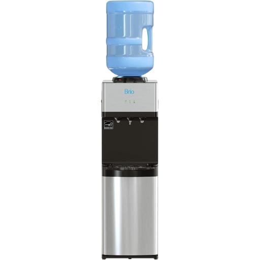 The Brio CLTL520 is a top-loading water dispenser that merges practicality with polished style. Made with stainless steel, it supports 3- or 5-gallon water bottles and dispenses hot, cold, and room temperature water. It’s a solid fit for households or small offices looking for a no-fuss hydration solution with a few premium touches.